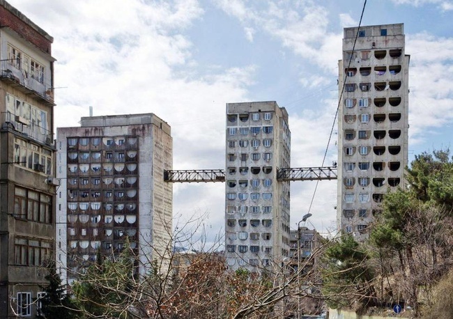 Необычная архитектурная достопримечательность Тбилиси обычно привлекает внимание приезжих. Три панельные многоэтажки соединены между собой длинными пешеходными мостами на довольно большой высоте. Да не просто соединены, а мост «пронизывает» их насквозь. Захватывающее зрелище! Но зачем? Что интересно, эти многоэтажки построены во времена СССР, когда города застраивались зданиями по типовым проектам, и даже в разных городах дома были похожи друг на друга как братья близнецы. Хотя бы, сюжет фильма «Ирония судьбы, или С лёгким паром» помните? Фильм был снят в 1975 году. А вот в 1978 году в Тбилиси были построены очень даже «не типовые» три шестнадцатиэтажных дома с мостами. Это прямо нетипичное исключение из правил жилищного строительства того времени. Уникальный проект создал и руководил строительством этих домов Отар Каландаришвили. Нельзя сказать, что в мире нет больше подобных «по смыслу» проектов. Есть, например, в Китайском городе Чунцин. Но там пешеходный мост на высоте де