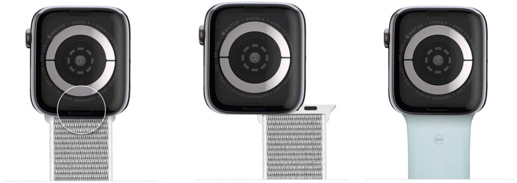 - Расположение кнопок: На задней стороне корпуса Apple Watch, рядом с местом крепления ремешка, вы увидите две продолговатые кнопки фиксатора — по одной с каждой стороны.