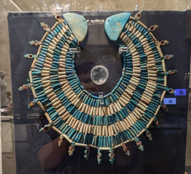 У древних египтян было огромное количество золота. Они изготовляли множество загробных вещиц, которые фараоны обязательно хотели взять с собой в загробную жизнь, а брали в гробницу, искушая расхитителей. До нас неразграбленной дошла только гробница Тутанхамона с удивительными золотыми поделками начиная от знаменитой маски и заканчивая напёрстками на каждый палец на руках и ногах. Так что золотых украшений сохранилось много, но вот сочетали древние египтяне золото не с драгоценными камнями, а с обычным стеклом, потому что ни сапфиров, ни изумрудов, ни бриллиантов у них не было. Самым популярным и известным украшением египтян было ожерелье усех. Типичное ожерелье выглядело вот так: Конечно, очень богатые люди могли сделать себе такое из золота, но обычные люди изготовляли такое из обычной керамики и стекла. Не сильно впечатляет, правда? Похоже на детскую поделку. Носили такое ожерелье и женщины и мужчины. Некоторые изготовляли наборы из ожерелья и браслета. Бусы с довольно большой