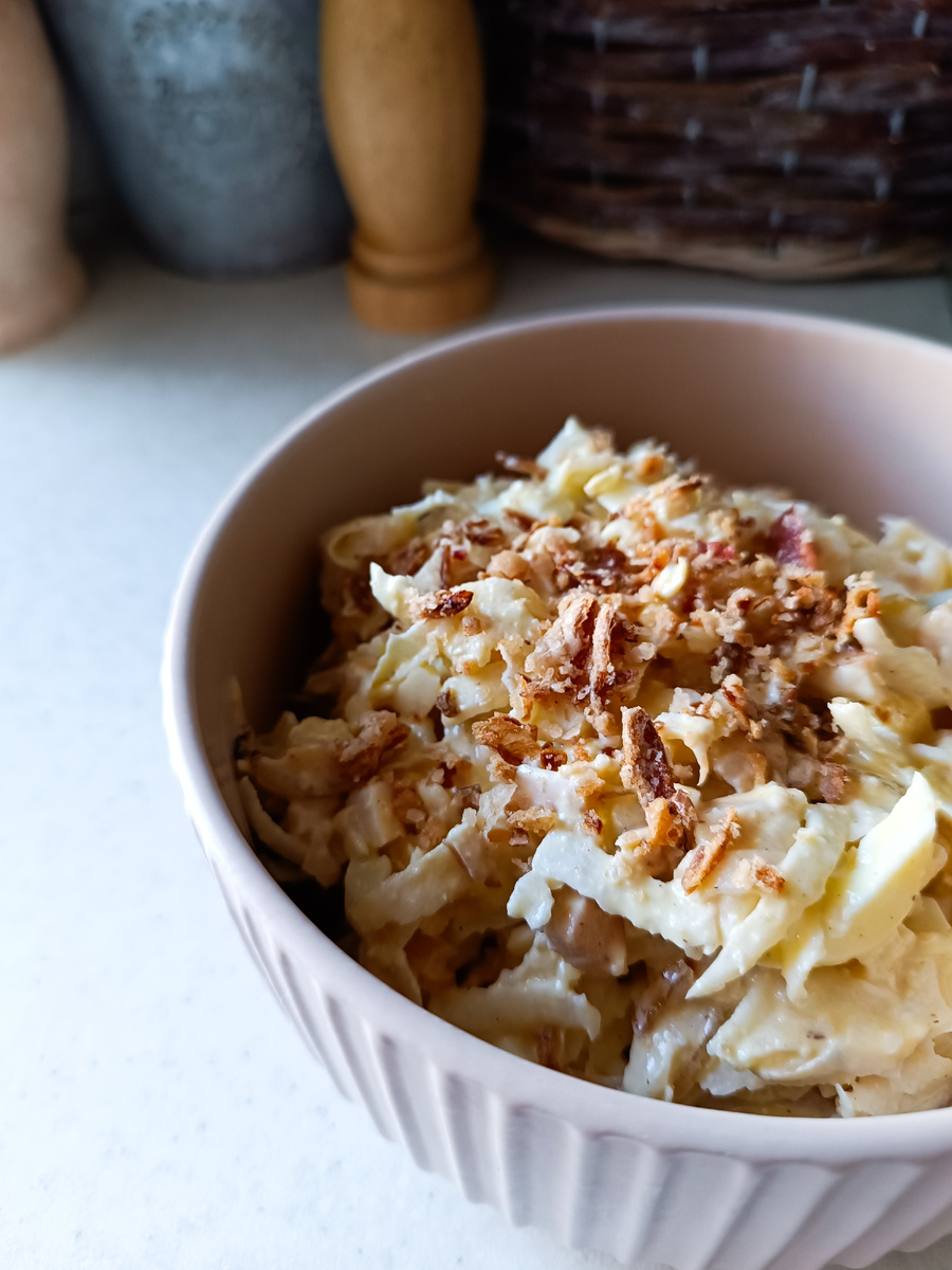 Великолепное сочетание ярких вкусов в одном блюде: свежий дайкон, копчёная курочка и жареный лук 🤤 Сытный и очень вкусный салат! А также суперэкономный для тех, кто вырастил часть ингредиентов на своем огороде) 1. Дайкон моем, при необходимости чистим и натираем на крупной тёрке. 2. Яйца отвариваем, измельчаем с помощью яйцерезки или также трём на крупной тёрке. 3. Репчатый лук нарезаем полукольцами или перьями, обжариваем на небольшом количестве растительного масла до золотистости. 4. Курицу отделяем от кости, режем на небольшие кусочки. 5. Соединяем все ингредиенты с майонезом, тщательно перемешивая. Вуаля! Сочный, сытный, ароматный, ооочень вкусный салат из дайкона с копчёной курицей готов!