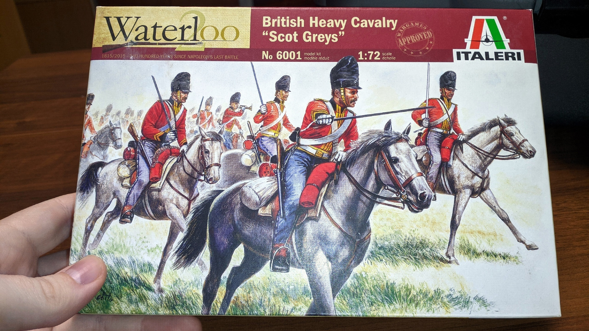 Как понимаю, цвет пластика является пасхалкой, однако как же приятно — из похожего пластика был выполнен мой первый набор солдатиков 72 масштаба (тевтонцы). Что вдвойне приятно, мои опасения не оправдались. Поехали! 🙂 «Королевский Северо-Британский драгунский полк начал свою историю в 1678 году как «Шотландские драгуны». Спустя три года его переименовали в Королевский полк Шотландских драгун. Каждый полк британской кавалерии ездил на лошадях своей масти, Уже тогда солдаты и офицеры полка ездили на серых лошадях, что и явилось причиной неофициального названия «Серые драгуны». А прозвище «Шотландские Серые», под которым полк прославился в наполеоновских войнах, драгуны получили в 1707 году. С 1877 по 1971 год это прозвище было официальным названием. Независимо от масти «полковых» лошадей трубачи всегда сохраняли право на серых лошадей. В сочетании с яркой униформой это облегчало их поиск в условиях сражения. И только трубач «Шотландских Серых» ездил на чёрной (вороной) лошади». P.S. Спр