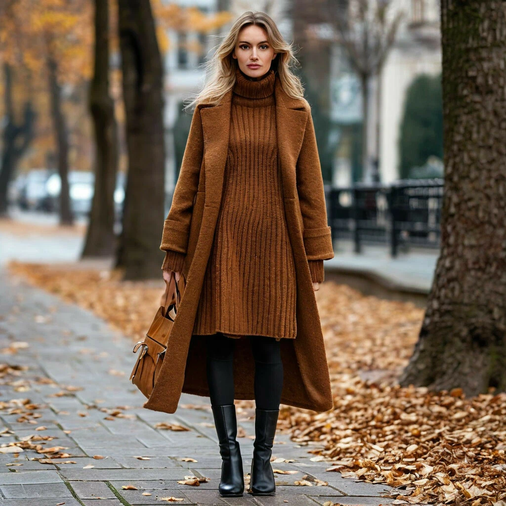Холодная погода — не повод отказываться от любимых платьев. Правильно подобранная верхняя одежда, обувь и аксессуары помогут создать стильные и теплые образы, которые сохранят ваш комфорт в прохладные осенние и зимние дни. В этой статье разберем семь готовых луков для повседневного и вечернего стиля. Трикотажное платье — идеальный выбор для холодного сезона. Оно удобно и тепло, но при этом подчеркивает фигуру. Комбинируйте его с классическим пальто прямого кроя. Лучше выбрать модель длиной до колена или чуть ниже — это не только согреет, но и придаст образу элегантности. Высокие сапоги на устойчивом каблуке завершат стильный аутфит. Добавьте плотные колготки (оптимальный вариант — от 60 до 100 den) для тепла и уюта. Совет: Темные цвета платья и пальто создадут изысканный образ, а если хочется добавить яркости, можно выбрать сапоги насыщенного цвета, например, бордовые или коричневые. Платья-свитеры уже несколько сезонов остаются на пике популярности. Это универсальная вещь, которая ле