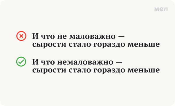 Наречие «не (маловажно)» можно написать как слитно, так и раздельно — всё зависит от контекста. Впрочем, этот принцип можно применить к большинству наречий, что еще раз доказывает их сложность, неоднозначность и коварство. Поэтому мы так часто о них и пишем. Правильно: что немаловажно Вообще с этим словом всё очень сложно. По правилу «не» с наречиями пишутся слитно, если мы специально не подчеркиваем отрицание, а также если нет противопоставления. Вот здесь мы раскрыли несколько секретов того, как отличать усиление отрицания от усиления утверждения. В большинстве случаев использования наречия «(не)маловажно» предпочтение отдают всё же слитному написанию, как в нашем примере: можно заменить «немаловажно» синонимом «очень важно». Но если перед наречием есть усилительные отрицания вроде «отнюдь не», «далеко не», «ничуть не» и другие, тогда наречие с «не» точно пишем раздельно. Больше полезных карточек о русском языке — в «Грамотности» на «Меле» в Telegram. Подписывайтесь, чтобы говорить и