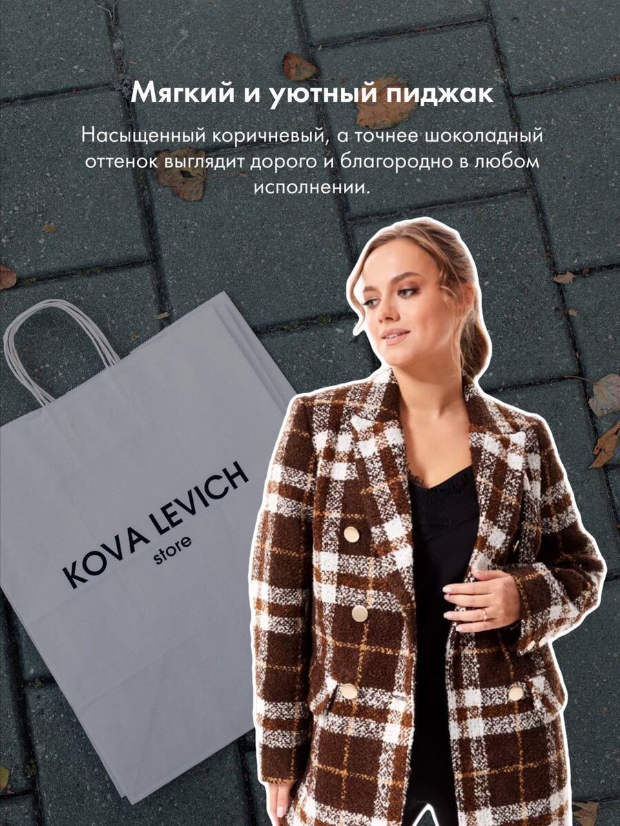 Изысканный, благородный, мягкий — всё это про оттенок этого сезона. Коричневый такой же универсальный, как и черный, его легко сочетать с другими цветами. Пример актуального цвета в мягком и уютном пиджаке от Kovalevich - ссылка. Подробнее в картинках
