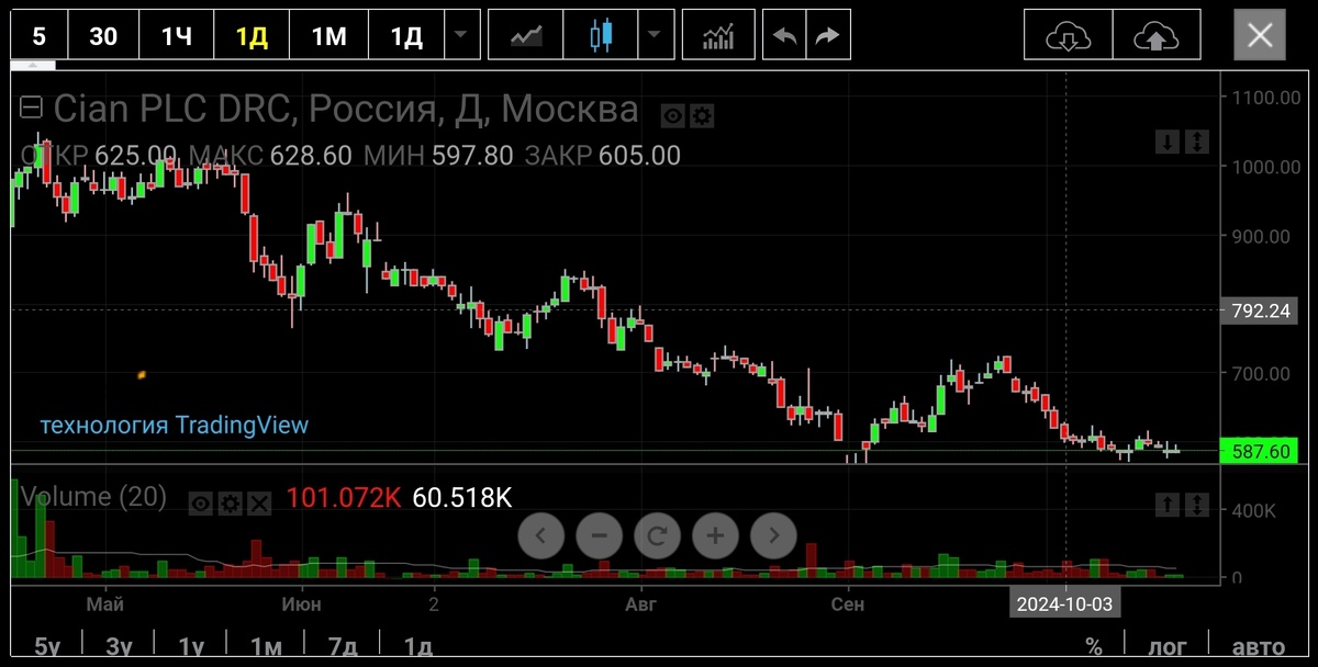 Могут ли компании обслуживающие рынок недвижимости служить маркером трендов? К примеру ЦИАН. В Москве и Петербурге он является безусловным лидером среди классифайдов. Все игроки рынка недвижимости подают сюда рекламу. С регионами сложнее, там царит Авито. Но для анализа сойдут и рынки недвижимости двух столиц. Смотрим на акции ЦИАН и видим, что их котировки с пиков мая 2024 года в 1030 руб. потеряли более 40% своей стоимости. Даже после небольшого отскока они все равно ниже майских уровней на 39%. Темпы роста выручки снижаются. Она во 2м квартале 2024 года выросла на 21%, до 3,2 млрд руб. В 1кв'24 было +31%, а в 2023 году +40%. Очевидно, что снижение выручки является прямым следствием снижения затрат рекламодателей на рекламу и закупку лидов, которые любили игроки рынка новостроек. Так же увеличение выручки можно объяснить поднятием ЦИАН цен на рекламу во 2м квартале 2024. Почему же падают акции ЦИАН? Может это всего лишь игра акционеров или маркетмейкеров, а не жёсткая рука