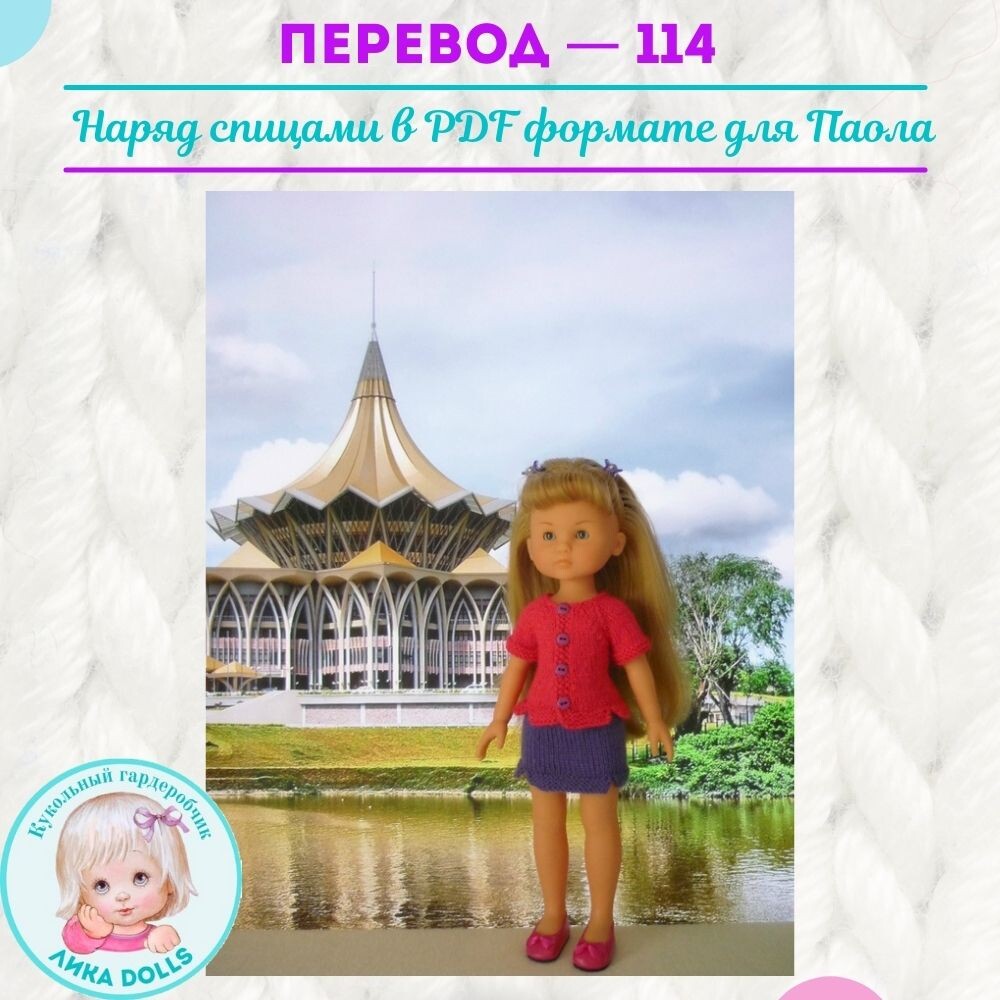 Материал: - пряжа 50гр/210м (76% акрил, 24% шерсть); - спицы № 25 мм Условные обозначения: лиц. – лицевая петля изн. – изнаночная петля лицевая гладь – 1 ряд вязать лицевыми петлями, 2 ряд вязать изнаночными петлями платочная вязка – все ряды вязать лицевыми петлями убавления – провязать 2 петли вместе лицевой 2вм.вл. – первую петлю снять не провязанной, 1 лиц., перекинуть снятую петлю на провязанную 2вм.впр. – провязать 2 петли вместе Кромочные петли в описание не указаны. Юбка Вязание снизу вверх. Набрать 20 петель и вязать 6 рядов платочной вязкой, отложить вязание. Набрать 16 петель и вязать 6 рядов платочной вязкой, отложить вязание. Набрать 20 петель и вязать 6 рядов платочной вязкой, продолжить вязание, соединяя все части: 20 лиц., 16 лиц., 20 лиц. (56) Продолжить вязать лицевой гладью еще 30 рядов. В следующем ряду равномерно убавить 10 петель и связать в конце петлю для пуговицы. Связать еще 1 ряд лицевой гладью и закрыть все петли. Кофта Вязание снизу вверх. Набрать 11 петель