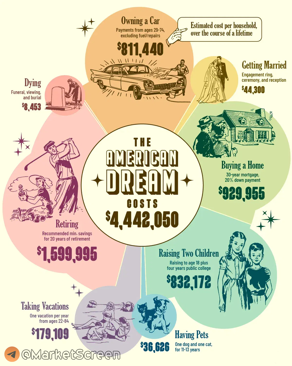 А давайте. Сегодня стоимость «американской мечты» составляет 4,4 млн $. Это приблизительные затраты семьи на все основные этапы жизни, включая вступление в брак, воспитание двоих детей, покупку дома, новых автомобилей, пенсионные накопления, ежегодные отпуска и всё вот это вот. Общая сумма более чем на 1 млн $ превышает доход большинства американцев за всю жизнь, хотя и не выходит за рамки того, что может заработать семья с двойным доходом. Средний обладатель степени бакалавра в США за свою карьеру зарабатывает около 2,8 миллиона долларов, при этом женщины зарабатывают 2,4 миллиона долларов, а мужчины - 3,3 миллиона долларов, согласно анализу Центра образования и трудовых ресурсов Джорджтаунского университета, проведенному Бюро переписи населения США. Если посмотреть на данные по домохозяйствам, то среднестатистическое американское домохозяйство, состоящее из двух человек, имеющих степень бакалавра, имеет заработок за всю жизнь 5,6 млн $. Вот примерные затраты на каждый важный жизненны