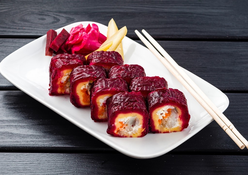 - Возьмите лист нори и положите его на коврик для роллов. Распределите по листу свеклу, оставив свободные края нори сверху и снизу. Это позволит вам легко свернуть ролл.