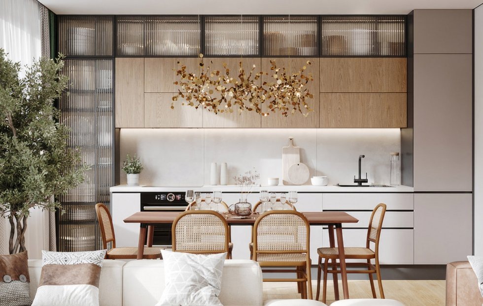 Кухонный гарнитур расположен вдоль самой дальней стены. Для кухни выбрано сочетание фасадов — однотонная эмаль в цвете тауп и шпонированный фасад. Сбоку находится стеклянная секция — буфет для красивой посуды и бокалов. Фартук у кухни — керамогранит.
