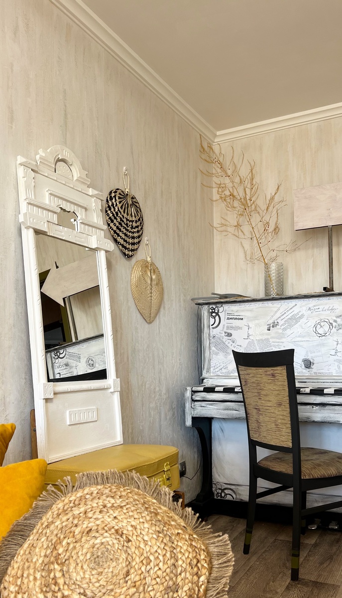 Бюджетный и быстрый ремонт, т.к. в этой статье расскажу об объекте, где мы даже не снимали старые обои - я их просто немного покрасила (видео тут) На обои ушло 2 банки краски по 0,9кг., 150 руб каждая. Нанесено в технике "без техники" – просто мазки по направлению вертикального рисунка обоев. Красила неравномерно: где-то больше краски, где-то меньше и просвечивают обои – так задумано. В процессе эксплуатации легко будет подкрашивать. Зеркало. Точнее только рама, куплена на Авито за 4000 руб.и покрашена белой акриловой краской 3 слоя. Рама картины покрашена той же краской что и дверь (ниже) Дверь покрашена краской Dulux для мебели и дерева 2в1 из ЛеманаПро, там же колеровала в цвет хаки 48YY 12/177. Сначала дверь отшлифована, обезжирена уайтспиритом и покрашена в 2 слоя по инструкции (видео короткое тут, длинное подробное видео тоже на канале имеется) Цвет на раскладке Dulux в ЛеманаПро: ПИАНИНО покрашено в технике декупаж, использована черная краска Brosco и белая акриловая. Ссы