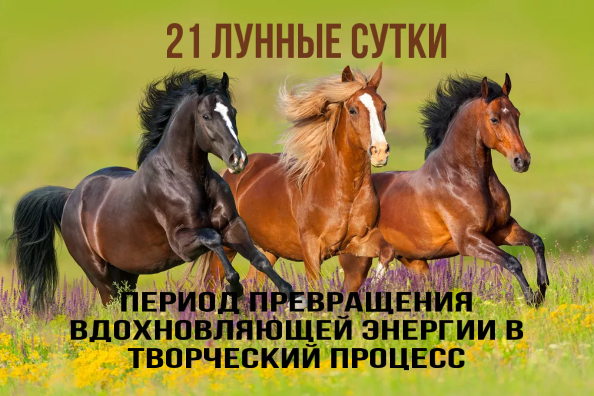 В различных культурах «КОНЬ» ассоциируется с такими качествами, как разум, интеллект, мудрость, свет, мышление, время, мужественность и власть, а также с творческим началом. Крылатый конь символизирует Солнце или Вселенную, отражая чистый интеллект, жизнь и свет. Карл Юнг видел в коне олицетворение магической стороны человеческой натуры, интуитивное понимание мира. Энергия 21 дня луны тесно связана с нашей печенью и кровью. В астрологии Стрельцы, из-за своей безответственности, могут столкнуться с заболеваниями кровеносной системы и лимфой, поскольку недооценивают важность правильного питания и здорового сна. Чрезмерное возбуждение и эмоциональное напряжение могут привести к проблемам с нервной системой. Поэтому в эти дни луны важно сохранять баланс (согласовывать физические возможности с творческим вдохновением), несмотря на то, что это активный и творческий период. Чтобы избежать эмоционального застоя, не стоит позволять себе беспокойство и гнев. В метафизической интерпр