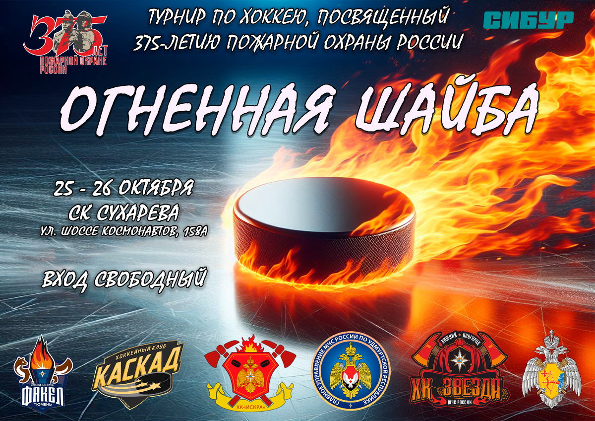 В Перми на ледовой арене спортивного комплекса В.П. Сухарева 25-26 октября пройдет турнир по хоккею «Огненная шайба» среди сборных команд Главных управлений МЧС России. Выйдут на лед и проверят свои силы более 100 спортсменов из Нижегородской, Кировской, Тюменской областей, Удмуртской Республики и Пермского края. Спортивные баталии разразятся по адресу: г. Пермь, ул. Шоссе Космонавтов, 158а. 25 октября: