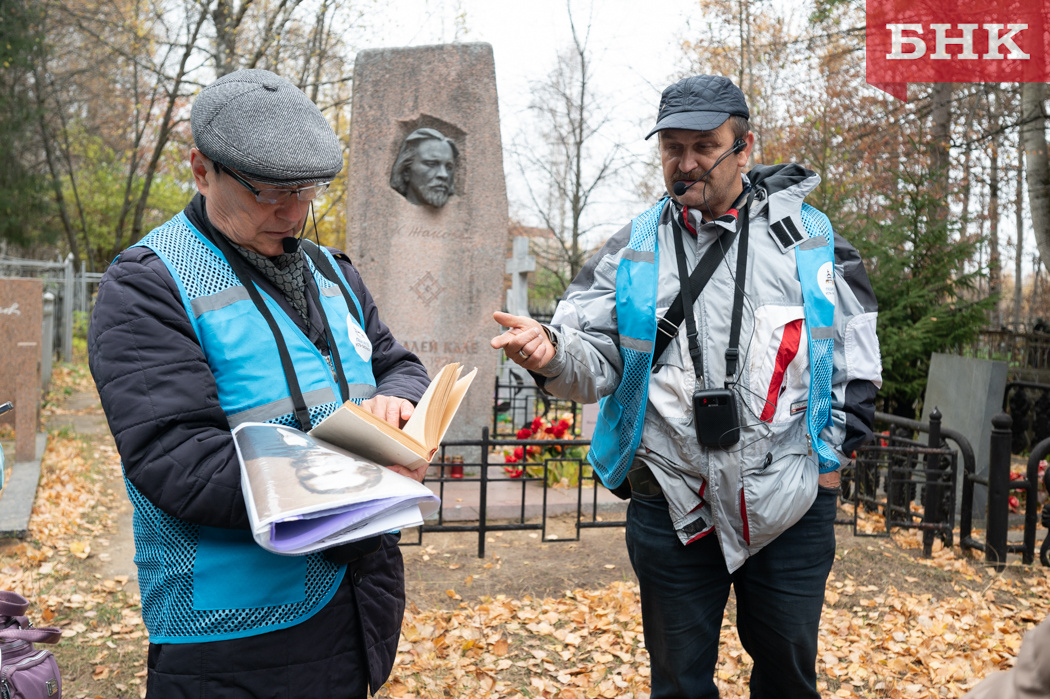 В Сыктывкаре состоялась очередная экскурсия в рамках проекта «Пешком по Усть-Сысольску». В этот раз экскурсоводы рассказали историю кладбища Сыктывкара и показали могилы родителей олигарха Романа Абрамовича. Фото Константина Стратиенко Самое древнее кладбище и легендарное кладбище В Сыктывкаре есть легенда о том, что самое старое кладбище находилось в парке имени С.М. Кирова на перекрестке Орджоникидзе — Кирова. Но документы не подтверждают эту легенду. Зато официально подтверждено, что кладбище находилось на месте улицы Кутузова. Ходила легенда, что там были похоронены пленные французы: якобы во время строительства там нашли ботфорты. Но ботфорты носили только офицеры французской армии, а у нас находились 100 рядовых. Похороны, кража, похороны Далее экскурсоводы рассказали об известных людях, похороненных на кладбище. Философа, этнографа и писателя Каллистрата Жакова хоронили трижды. Первый раз его похоронили в Риге, где находилось две группы последователей его философии лимитизма. Од