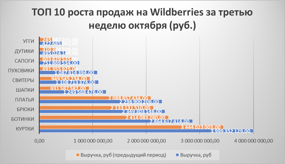 На третьей неделе октября 2024 года на платформе Wildberries был зафиксирован значительный рост продаж по различным категориям сезонных товаров. Это связано с приходом холодов и активным пополнением гардеробов покупателей осенне-зимними вещами. Рассмотрим топ-10 категорий, которые продемонстрировали наибольший рост выручки. Топ-10 категорий с наибольшим ростом выручки: Анализ и причины роста Очевидно, что с наступлением осени и приближением зимы покупатели начали активно приобретать теплую одежду и обувь. Наибольший рост наблюдается в категориях курток, ботинок, свитеров и шапок, что подтверждает адаптацию потребителей к холодам. Особое внимание стоит уделить пуховикам и дутикам, продажи которых резко возросли, что связано с популяризацией этих видов одежды среди покупателей. Таким образом, осенний сезон на Wildberries характеризуется стремительным ростом спроса на теплые и комфортные товары, что открывает большие возможности для ритейлеров в данных сегментах. Раскройте потенциал вашег