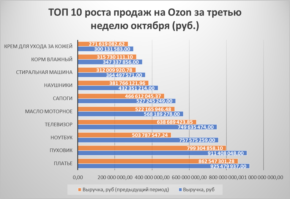 В третью неделю октября платформа Озон показала положительную динамику в ряде категорий товаров, что свидетельствует о интересе покупателей и изменении потребительских предпочтений. Данные за этот период демонстрируют значительный рост выручки по десяти категориям. Рассмотрим подробнее каждую из них. 1. Платье Выручка: 925 479 937 ₽