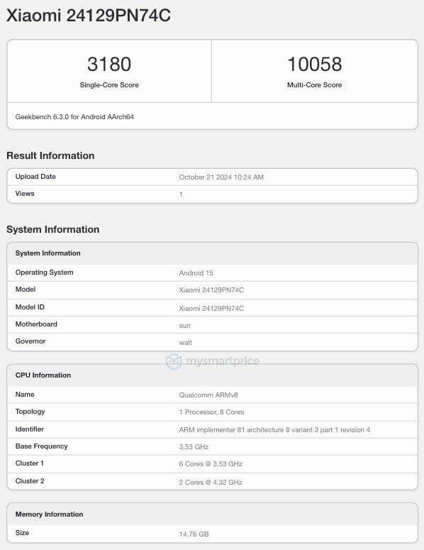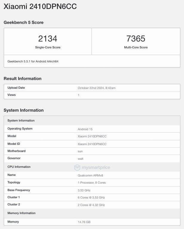 Xiaomi 15 с чипом Qualcomm Snapdragon 8 Elite прошел тестирование в бенчмарке Geekbench 6.3.0, что дало первые данные производительности SoC.