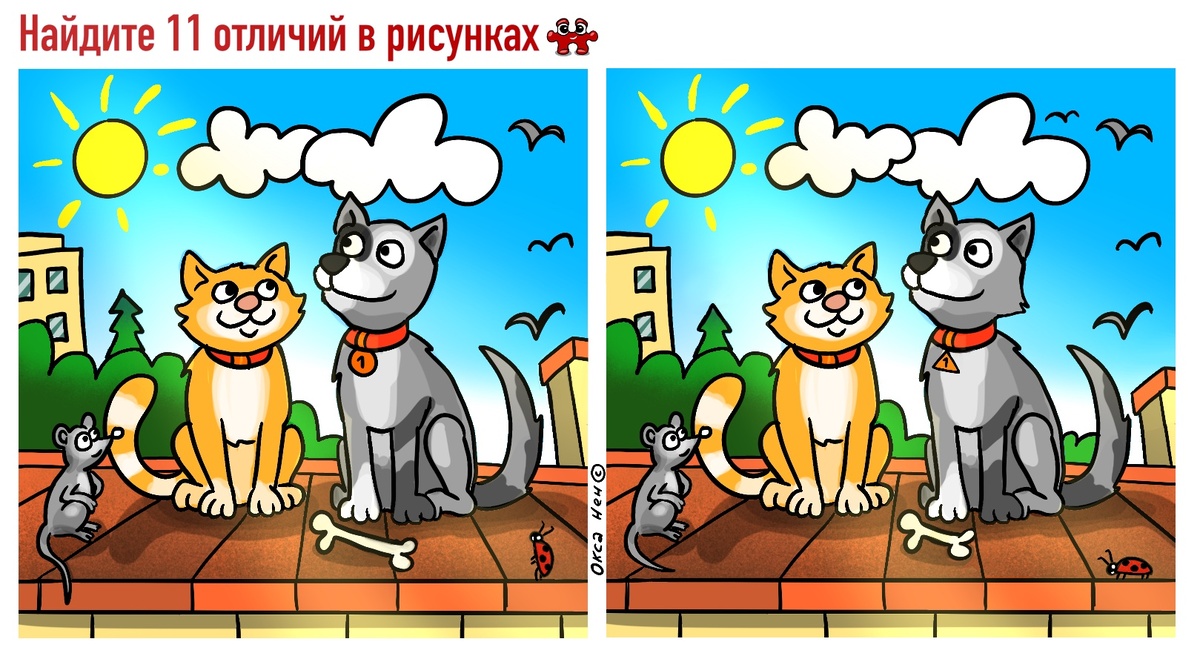 11 отличий на картинках про кота и собаку. Часть 2. Полезные задачки для внимательных.