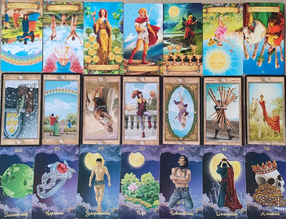 Кстати, странности вчерашнего понедельника чётко демонстрируют карты. Первый триплет (10 кубков перевернутая+5 пентаклей перевернутая+оракул Земной шар) читаем так: напряженка, расхождение во мнениях, противостояние с кем-то и всё это как-то перекликается с материальной темой. Денег не хватает. Карманы почти пусты, да и со здоровьем не всё в порядке. Оно хромает, а в таком состоянии, сами понимаете, с горой дел не справишься. Вот вам и опоздания, и неуспевания, и отставания. Но мы не сходим с дистанции и шагаем во вторник.