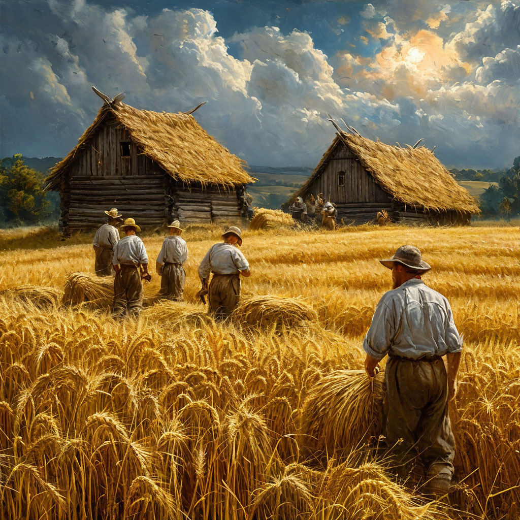 Мама мия! Да тут явно Мосфильм работает! Причем на декорации и костюмы не поскупились! За лесом было небольшое поле, засеянное какими-то злаками, а за полем виднелись избы. Натуральные, из темных бревен с соломенными крышами. Такие и сейчас можно увидеть, вот только окошки сейчас стали вставлять в основном стеклянные, а не из бычьего пузыря. Но главное было не в этом. На поле работали люди. Несколько женщин в холщовых платьях до земли, с забранными под косынку волосами, серпами жали те самые злаки. Прямо иллюстрация к стихотворению Некрасова «Тяжкая долюшка женская»! А рядом с ними мужички одетые почти также как и прыгучий бортник, сноровисто собирали уже связанные снопы и относили к приземистому сарайчику.