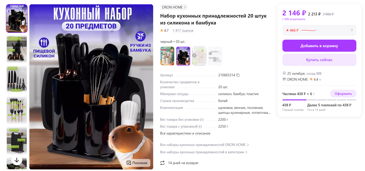 Всем привет. Кружку удобней купить одну, но вот, например, кухонные мелочи лучше - разом. Набор кухонных принадлежностей из 20 предметов, сделанных из прочного силикона и экологичного бамбука. Идеально подходит для приготовления пищи и украшения кухни. Артикул - 210865314 Рейтинг - 4.7 *Это просто любовь с первого взгляда. Набор шикарен, пришёл в срок, коробка целая, содержимое коробки в идеальном состоянии, нет не одной царапины. Роскошное, мягкое и уютное постельное белье на двуспальную кровать - идеальное сочетание комфорта и стиля для спальни. Артикул - 243203186 Рейтинг - 4.8 *Отличный комплект. После стирки не полинял, цвета яркие Эти стильные шторы блэкаут обеспечат идеальное затемнение и защиту от солнечных лучей, создавая уютную атмосферу в интерьере. Артикул - 218932685 Рейтинг - 4.7 *Шторы - огонь!!! Качество хорошее! Пока не гладила, но все равно смотрится отлично. Парная комплектация: банный килт и стильный тюрбан из мягкого и впитывающего материала для удобной сушки в