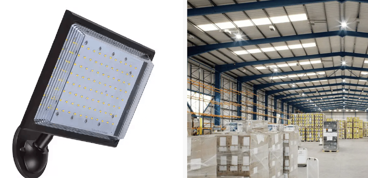 Для освещения открытых территорий используются светодиодные прожекторы, которые эффективно работают даже в суровых погодных условиях. Это особенно важно для промышленных объектов с большой территорией или внешними складскими зонами.