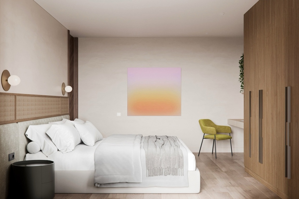 Функциональная спальня в проекте от "Студии 33" в ЖК Любовь (Екатеринбург) Для заказчиков было важно, чтобы в спальне была не только зона отдыха, но и рабочее пространство и системы хранения. Чтобы вписать все пожелания и не уйти в хаос, спальню выполнили в стиле японского минимализма. Был выбран нейтральный шкаф, а рабочий стол с помощью повтора цвета стен сделали незаметным. Уюта добавили с помощью ротанга на изголовье, светлого текстиля и теплой картины на стене.