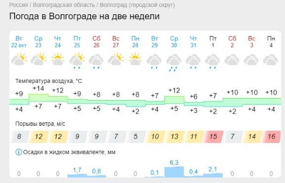 Это тепло, которое к нам заглянет, будет очень коротким явлением. Если верить информации от сервиса Gismeteo, то завтра, 23 октября, в Волгограде воздух прогреется до +14 градусов тепла, облачно. В четверг, 24 октября, будем наблюдать похожую погоду — до +12. А вот в пятницу нас снова ждет понижение температуры и уход тепла. Сервис говорит, что в этот день будет уже +9. Температура до +12 при дожде ожидается еще в предпоследний день октября, 30 числа. В остальные дни после потепления дневная температура уже не сможет подняться выше +8. Месяц и вовсе проводим с отметкой +6. В пресс-службе волгоградского ЦГМС говорят, что да, действительно, завтра-послезавтра воздух в области прогреется до +15. Местами днем будут наблюдаться порывы ветра до 14 м/с. В Волгограде по этим данным — +13 — +14 тепла. Виновником краткосрочного потепления может быть штормовой британец «Эшли». В погодном центре говорят, что, добравшись до России, этот циклон уже растерял весь свой штормовой потенциал, его влияние