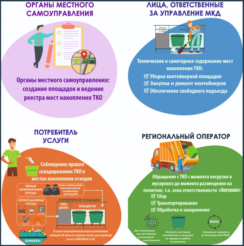 В сфере обращения с отходами много участников: потребители — население, организации, индивидуальные предприниматели, органы местного самоуправления, управляющие компании и, конечно, региональный оператор. Все они неразрывно связаны в этом процессе, и у каждого есть своя зона ответственности: