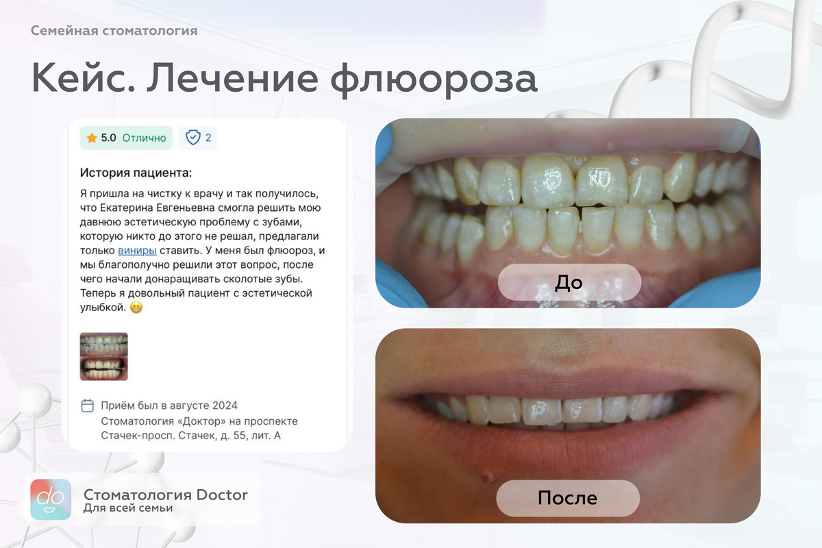 Флюороз - заболевание, проявляющиеся в виде белых или коричневых пятен на эмали, что напрямую влияет на эстетику улыбки. Однако нет ничего невозможного для современной стоматологии. Сегодня хотим поделиться случаем из практики нашего терапевта - Шариповой Екатерины Евгеньевны. В клинику Doctor обратилась пациентка с проблемой флюороза. Заболевание поразило абсолютно все зубы. В качестве метода лечения была выбрана микроабразия. Этот метод позволяет устранить неравномерную окраску зубов без необходимости использовать бормашину. Как работает микроабразия? Процедура включает в себя аккуратное сошлифовывание тонкого слоя эмали с последующим полированием. Толщина снимаемого слоя обычно варьируется от 12 до 60 мкм., что гарантирует отсутствие серьезных необратимых последствий. Важно отметить, что это косметическая, а не терапевтическая процедура, направленная на улучшение внешнего вида зубов. В отличие от реставраций композитными материалами, микроабразивная обработка минимально меняет конту