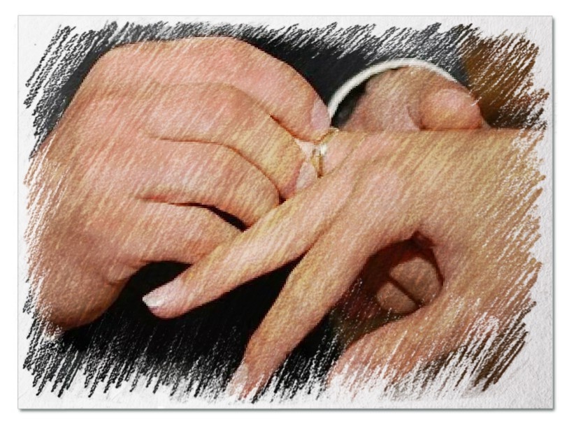 Мужчина взял кольцо и надел его молодой женщине на безымянный палец.