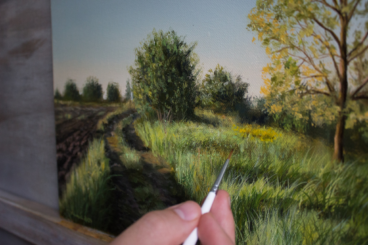 Я помню, понемногу садилось солнце, дул небольшой ветерок, который легонько расчесывал траву словно волосы. Небо было спокойнее воды в стакане, а облака были видны только на краю горизонта. Пели птицы, стрекотали кузнечики и цикады. Одним словом наступал вечер. Мы шли, ты и я и она - наша доченька. Но она не ходит, она всегда бежит. Бежит радуясь и наслаждаясь моментом, видя больше нас и всегда чувствуя сердцем. Я остановился, обернулся и увидел - "Дорогу домой" и мы стоим на ней. И ты, и я и она... "Дорога домой" масло на холсте 2024г. (41х33 см)