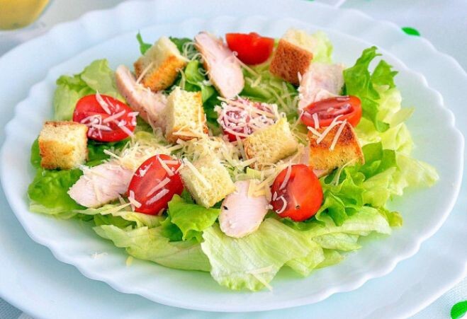 Салат Цезарь классический с курицей. Состав / ингредиенты Изменить состав Порций: 4 Салат Айсберг 400 гр Куриное филе 280 гр Помидоры черри 10 шт. Батон 220 гр Пармезан 80 гр Чеснок 1 зубч. Растительное масло 1 стол.л. Соль по вкусу Перец черный молотый по вкусу Для соуса: Оливковое масло 60 мл Пармезан 20 гр Яйца 1 шт. Горчица 2 чайн.л. Чеснок 1 зубч. Сахар 1 чайн.л. Соль 0.5 чайн.л. Как сделать Салат Цезарь классический с курицей? Подготовьте продукты для приготовления салата. Батон нарежьте на небольшие кубики. На сковороду налейте немного растительного масла, положите очищенный и раздавленный зубчик чеснока. Выложите нарезанный хлеб, перемешайте. Жарьте гренки на самом маленьком огне до хрустящего состояния. Время от времени их необходимо перемешивать. Если чеснок начнет подгорать, уберите его. Именно поэтому его не надо сильно измельчать. Как подобрать сковороду и масло для жарки читайте в статьях на эти темы. ссылки есть в конце рецепта. Куриное филе нарежьте