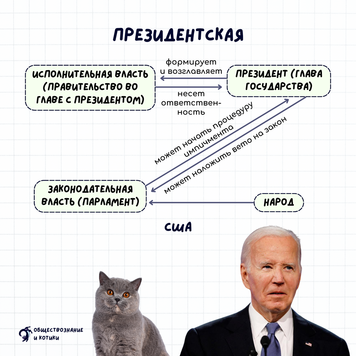 Изучаем карточки по видам республик ✍🏼 💡Кстати, мой любимый лайфхак: если вам нужно определить вид республики, то обратите внимание на одно единственное условие Кто формирует правительство и перед кем оно несет ответственность? ☑️ в президентской — президент (всенародно избираемый глава государства) формирует и возглавляет ☑️ в парламентской — формируется из членов победившей на выборах в парламент партии ☑️ в смешанной — президентом и парламентом совместно