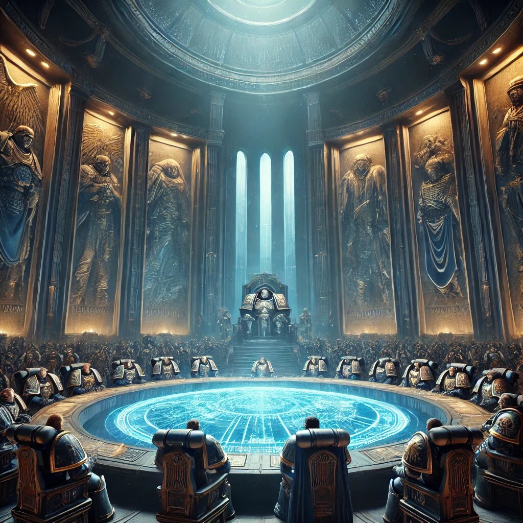 Под куполом Зала Совета, освещённого ярким, но холодным светом, собралось множество военачальников и капитанов ордена. Их лица были серьёзными, взгляды сосредоточены, а их доспехи сияли в свете, как напоминание о великой силе, которую представляли эти воины.