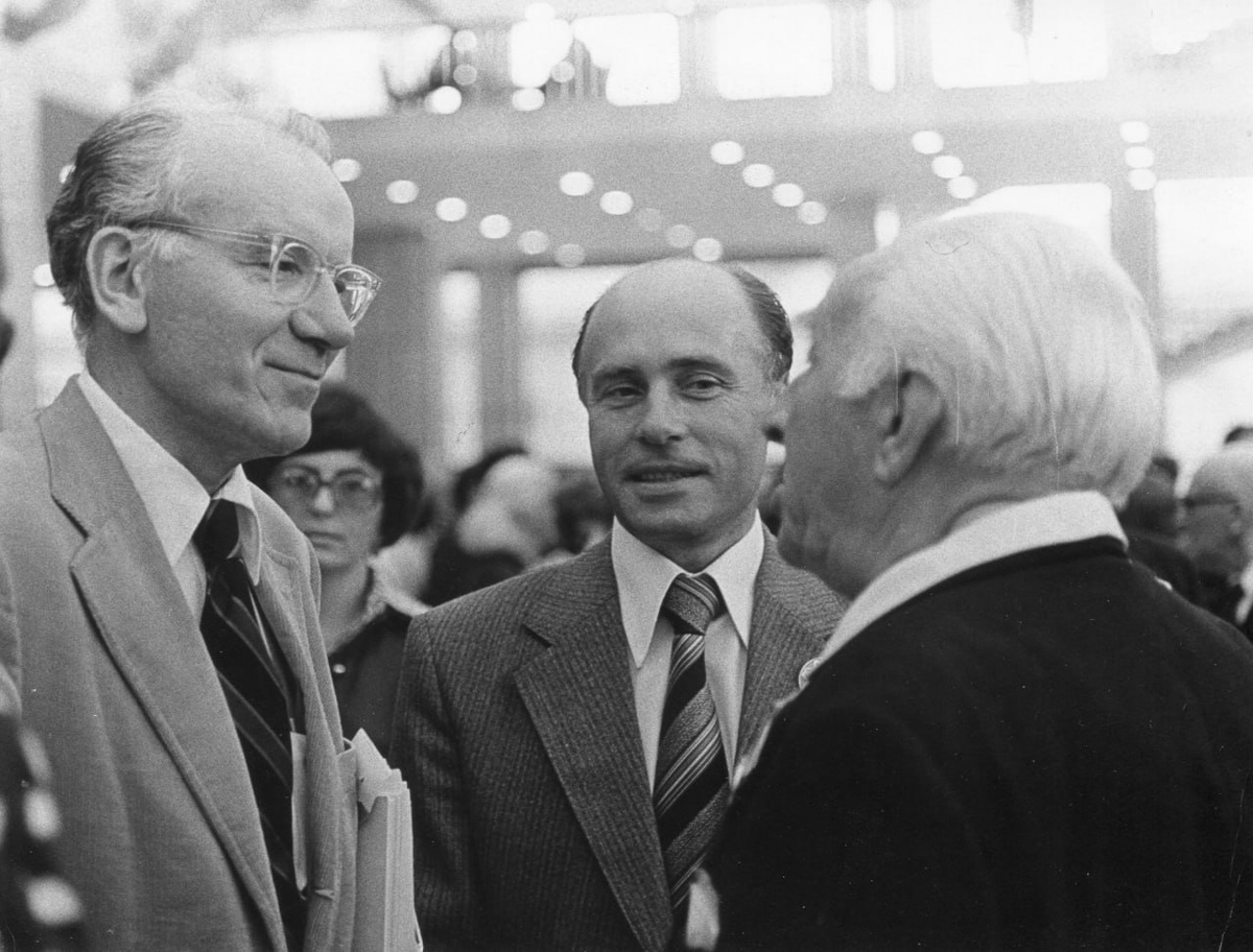 На фото слева направо: американский ученый Виктор Маккьюсик, советские генетики Николай Павлович Бочков и Николай Владимирович Тимофеев-Ресовский, XIV Международный генетический конгресс, Москва, 1978 год