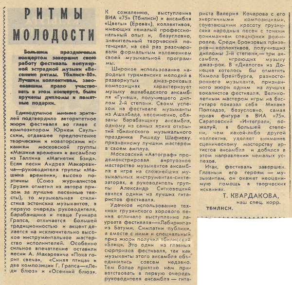 Большим праздничным концертом завершил свою работу фестиваль популярной эстрадной музыки «Весенние ритмы. Тбилиси-80». Лучшим коллективам, завоевавшим право участвовать в этом концерте, были вручены дипломы и памятные подарки. Единодушное мнение зрителей подтвердило авторитетное жюри фестиваля во главе с композитором Юрием Сеульским, отдавшее предпочтение творческим и новаторским исканиям московской группы «Машина времени» и ансамблю из Таллина «Магнетик Бэнд». Если песни Андрея Макаревича — руководителя группы «Машина времени», высоко поэтичны (Союз журналистов Грузии отметил их автора призом за лучшие песенные тексты), то музыкальная стилистика эстонских музыкантов, в первую очередь руководителя, барабанщика и певца Гуннара Грапса, отличается большей традиционностью и акцент делается на исключительно высокое инструментальное мастерство исполнителей. Особенно сильное впечатление оставили песни А. Макаревича «Пока горит свеча», «Синяя птица» и две композиции Г. Грапса — «Леди блюз» и «