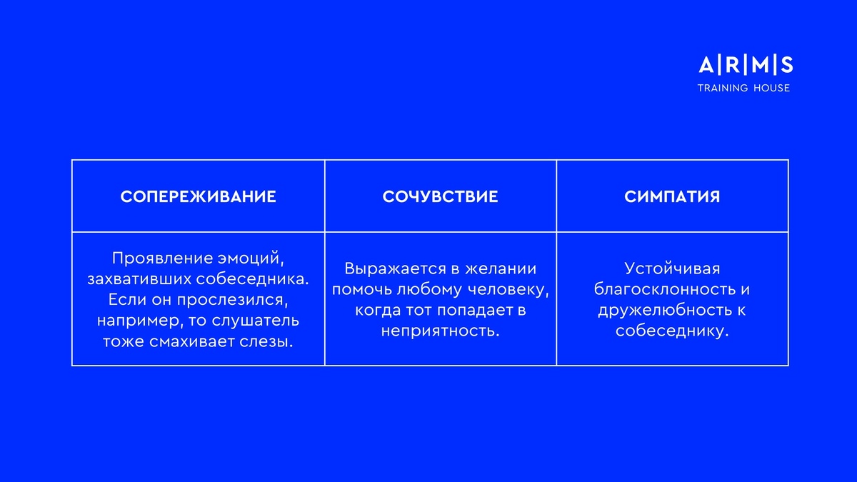Активное слушание насчитывает множество техник и методов. Общий смысл один: если вы показываете собеседнику, что понимаете и принимаете его эмоции, значит, вы все делаете правильно.