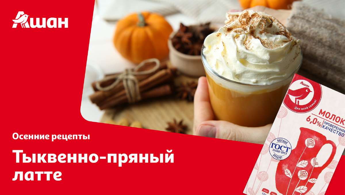 Нежный кремовый напиток для уютных осенних разговоров. Понравится даже тем, кто не очень любит тыкву: она приобретает неожиданные оттенки вкуса и идеально сочетается с кофе. Так что самое время заглянуть в Ашан и выбрать идеальную тыкву для ваших гастрономических шедевров! Время приготовления: 30 минут Количество порций: 1 Пищевая ценность (на 100 г): 42 ккал Ингредиенты на 1 порцию: Тыква — 100 г Кофе заваренный — 100 мл Ванильный сахар — 1/2 ч. л. Молоко 2,5% — 50–80 мл Сахар — 1 ч. л. По желанию: Имбирь — несколько кусочков Корица — для украшения Для начала нужно сделать тыквенное пюре. Порежьте тыкву на дольки и отварите до мягкости, слейте воду и пробейте мякоть блендером до состояния пюре. Но можно пойти другим путем: просто взять детское тыквенное пюре… Да, так можно было. Только тсс, никому не говорите. Все специи (ванильный сахар, сахар, имбирь) хорошенько растолките до состояния порошка и добавьте к пюре в небольшую кастрюльку. Перемешайте и доведите до горячего состояния на