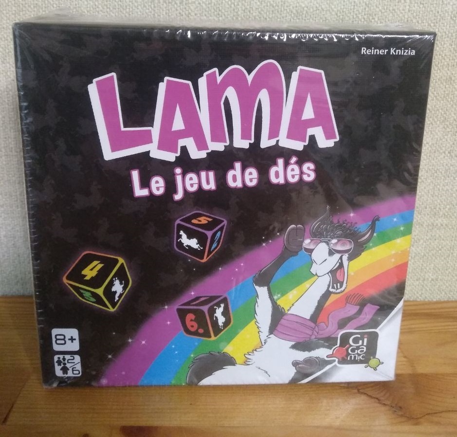Настольная игра Lama состоит из: -трех кубиков черного цвета. На одном кубике изображены: две ламы, цифры 1;2;5;6. На втором кубике- две ламы, цифры 1;3;4;6. На третьем кубике - две ламы, цифры 2;3;4;5. -белых и черных пластиковых фишек. -36 карточек с серой ламой на рубашке: из них 6 карточек с изображением ламы и по 5шт каждой цифры 1-6; -6 карточек с черной ламой на рубашке: лама и все цифры 1-6. Цель игры не набрать минус 40 очков. Тот кто первый их набрал проиграл и игра сразу заканчивается. Игра: на стол выкладываются все карточки с черной ламой на рубашке лицевой стороной: начиная от ламы заканчивая цифрой 6 (назову их центральными карточками). Каждому игроку раздается по 6 карт. Игрок в свой ход бросает три кубика и вот какие варианты возможны: -игрок выкидывает у себя с руки карточки с цифрами, которые выпали на кубике. Причем, если у игрока, например, две карты с цифрой 2, а выпало на кубиках только одно значение с цифрой 2, то игрок может выкинуть с руки только одну кар