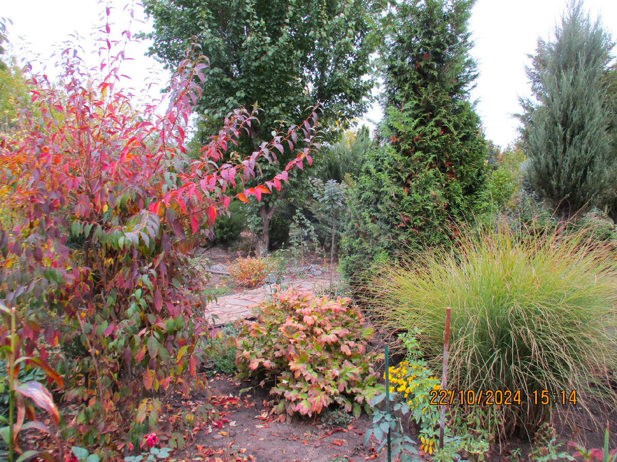 К нам при ходит осень! По некоторым растениям это уже хорошо видно. Сад находится в г. Тихорецке Краснодарского края. Расскажу о растениях, которые осенью украшают мой сад. Много деревьев ещё совсем зелёные, некоторые начали менять окраску листьев. На этом фото слева форзиция. У неё осенью всегда яркая листва. На заднем плане высокое зелёное дерево- это абрикос. В саду все растения растут вперемешку. У меня нет деления участка на фруктовые, хвойные, декоративные деревья. В центре кустик - древовидный пион. Рядом мискантус.
