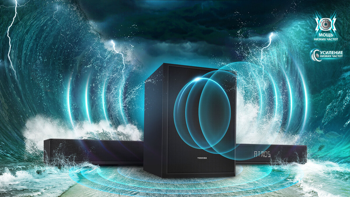 Хотите погрузиться в мир тончайших звуковых оттенков? Тогда вам определенно нужен саундбар Toshiba TS5120A, который точно передаст каждую ноту. Иммерсивный звук. Технологии Dolby Atmos и DTS-X создадут атмосферу полного погружения в сюжет. Два дополнительных динамика позволят увеличить мощность звука на 40 ватт, который будет отражаться от стен, создавая эффект объёмного звучания.