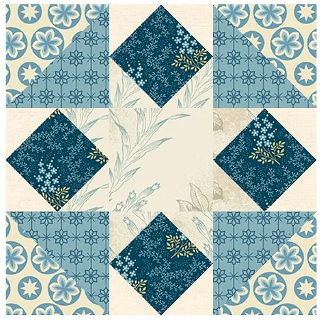 Инструкции по раскрою блока. 8 светлых треугольников из 4-х квадратов 1 7/8" 8 треугольников среднего тона из 4-х квадратов 1 7/8" 4 темных квадрата 1 7/8" 1 квадрат среднего тона 2 1/2" 4 треугольника среднего тона из 2-х квадратов 2 7/8" 4 темных треугольника из 2-х квадратов 2 7/8" Шьем блок «Квадрат в квадрате». Берем 2 светлых треугольника, 2 треугольника среднего тона из квадратов 1 7/8" и 1 темный квадрат Сшиваем 2 противоположных треугольника с квадратом (обратить внимание на то, что на одной стороне светлые треугольники, а на другой – чуть темнее). Разутюживаем. Добавляем 2 оставшихся треугольника и тоже разутюживаем. Размер детали с припусками должен быть 2 1/2". Шьем 4 детали. Далее шьем треугольники в квадрате. Сшиваем 1 треугольник среднего тона и 1 темный треугольник. Разутюживаем. Размер детали с припусками должен быть 2 1/2". Шьем 4 детали. Когда все детали блока готовы, раскладываем как показано на схеме. Сшиваем в ряды и разутюживаем. Ряды сшиваем между
