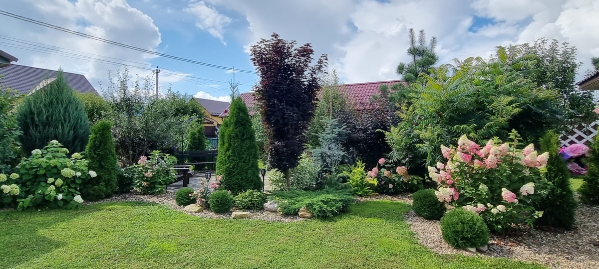 Приглашаю вас сегодня прогуляться по саду, которому идет всего лишь шестой год. Причем изначально участок был практически пустой, на нем росли лишь несколько плодовых деревьев. Предыдущие владельцы построили хороший дом из бруса, а жить в нем передумали, переехали в другой коттеджный поселок. Елена с супругом определились с покупкой дачи за неделю и ни разу не пожалели о своем выборе.