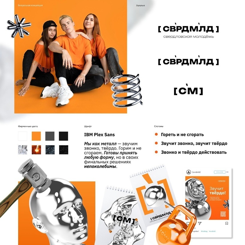 Логотипом победившей дизайн-концепции стал набор букв СВРДМЛД (расшифровывается как свердловская молодежь, — прим. ред.) или СМ. Ее придумали Анна Мухамадеева, Юлия Черепова, Алексей Музыкин и Евгений Смышляев. Фирменными цветами стали оранжевый, белый, серый и черный, а символом — металл. В качестве слоганов дизайнеры придумали фразы: Жюри — члены госорганизации «Дом молодежи» — согласилось с идеей авторов и анонсировали выпуск мерча. Визуальную концепцию разрабатывали в рамках Уральской креативной недели, ее проводили при поддержке министерства просвещения.