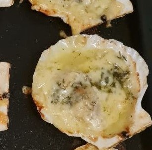 Берем гребешок морской в створке (у нас был замороженный), добавляем в каждую створку столовую ложку масла сливочного, смешанного с солью, чесноком и укропом (количество варьируется по Вашим вкусовым ощущениям), посыпаем тертым полутвердым сыром. Запекаем в духовке 10 минут при 180 градусах. Достаем и кушаем. Приятного аппетита!