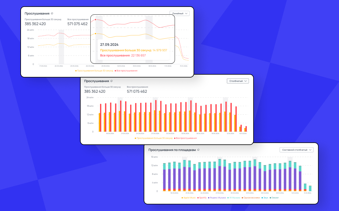 На графиках «Прослушивания» и «Прослушивания по площадкам» добавили меню для выбора вида отображения данных. Доступно три вида: линейный, столбчатый и составной столбчатый графики. Также на графиках появился столбец релизной пятницы — это один из способов ознакомиться с данными и отследить результаты релизов.