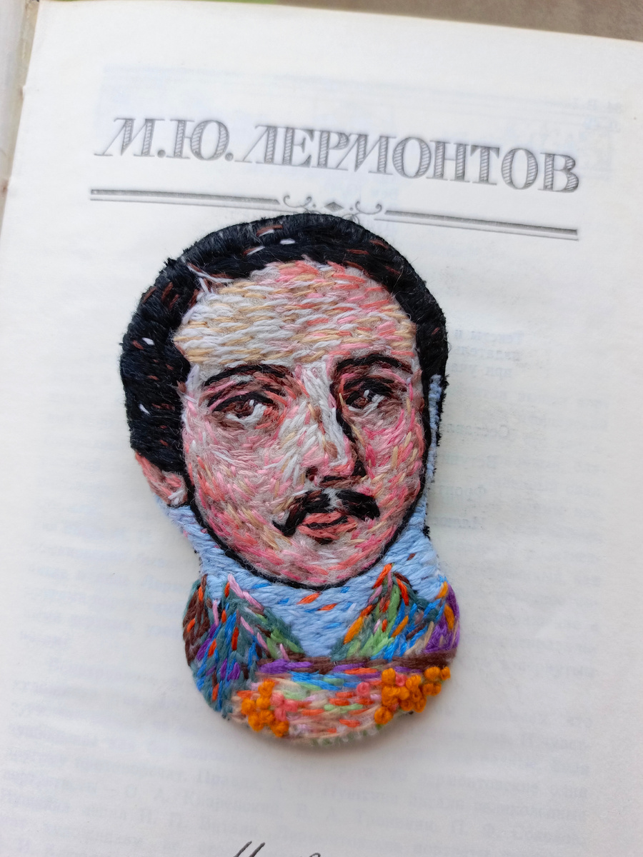 На одном из курсов по вышивке брошей у Ольги Балабановой мы вышивали русских писателей стилизованных цветами. С Толстым все просто, взяла и вышила цветы в бороде. Очень гармонично. С Лермонтовым так не получилось. Не идут цветы и все! Может еще потому, что для меня самой Михаил Юрьевич неразрывно связан с Кавказскими горами. Большую часть жизни Лермонтов провел на Кавказе. Жил, служил, и погиб недалеко от Пятигорска. Оттого и его произведения про кавказские горы пронизаны такой теплотой и любовью. Синие горы Кавказа, приветствую вас!.. Синие горы Кавказа, приветствую вас! вы взлелеяли детство мое; вы носили меня на своих одичалых хребтах, облаками меня одевали, вы к небу меня приучили, и я с той поры все мечтаю об вас да о небе. Престолы природы, с которых как дым улетают громовые тучи, кто раз лишь на ваших вершинах творцу помолился, тот жизнь презирает, хотя в то мгновенье гордился он ею!.. Часто во время зари я глядел на снега и далекие льдины утесов; они так сияли в лучах во