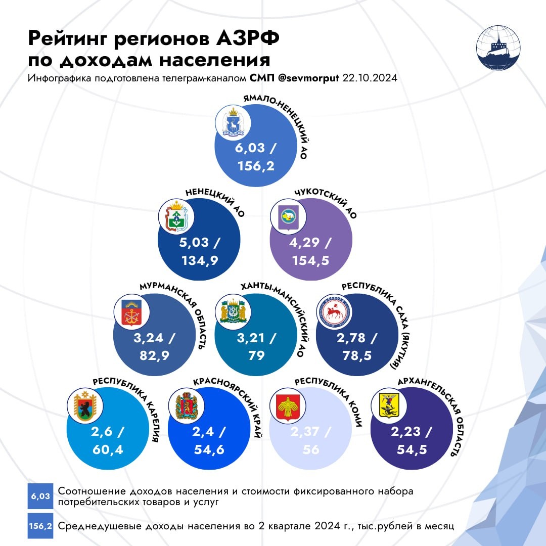 Субъекты АЗРФ возглавили рейтинг регионов России по уровню доходов населения, подготовленный экспертами агентства «РИА Рейтинг». На первом месте ЯНАО — здесь соотношение заработка населения к стоимости фиксированного набора товаров и услуг потребления составило 6,03. Средний доход — 156,2 тысячи рублей в месяц. На втором месте расположился Ненецкий автономный округ, соотношение в регионе равняется 5,03, средний доход граждан — 134,9 тысячи рублей. Тройку лидеров замкнула Чукотка, где ключевой показатель составляет 4,29 при среднем доходе 154,5 тысячи рублей. Отметим, что практически все остальные арктические регионы вошли в топ-25: ◾️Мурманская область, 8-е место: 3,24; средний доход 82,9 тысячи рублей. ◾️ХМАО, 9-е место: 3,21; средний доход 79 тысяч рублей. ◾️Республика Саха, 13-е место: 2,78; средний доход 78,5 тысячи рублей. ◾️Республика Карелия, 18-е место: 2,6; средний доход 60,4 тысячи рублей. ◾️Красноярский край, 24-е место: 2,4; средний доход 54,6 тысячи рублей. ◾️Республика