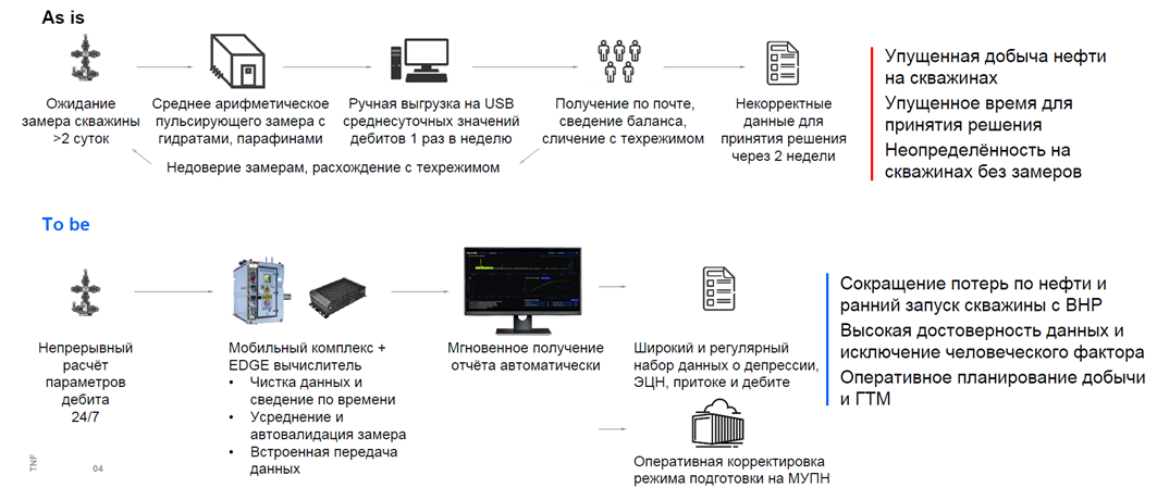 Вызовы Сегодня на гринфилдах диапазон изменений расхода на входе в установки ранней добычи может превышать 1,5 раза в течении месяца. В результате продукт не выходит на требуемый уровень качества. И это не потому что сложно подобрать нужный режим подготовки, а потому что вы не видите, что идёт со скважин. Классическая групповая АГЗУ не видит скважину 97% времени, а в условиях отсутствия кустовой телемеханики данные о дебите приходят в лучшем случае через неделю после прохождения потока. При этом условия эксплуатации и измерений такие, что многофазный расходомер (МФР) 90% времени работает вне паспортных характеристик. 20% расхождения баланса в таких условиях становятся нормой. Текущие проблематики: - ожидание на всех этапах – очереди на замер, оператор с флешкой для выгрузки, недоверие при сличении с техрежимом скважины и повторными замерами. - в период усреднения замера корректно не обрабатываются пульсации, не вычищаются периоды усреднения от нестационарных режимов, от переходных проц