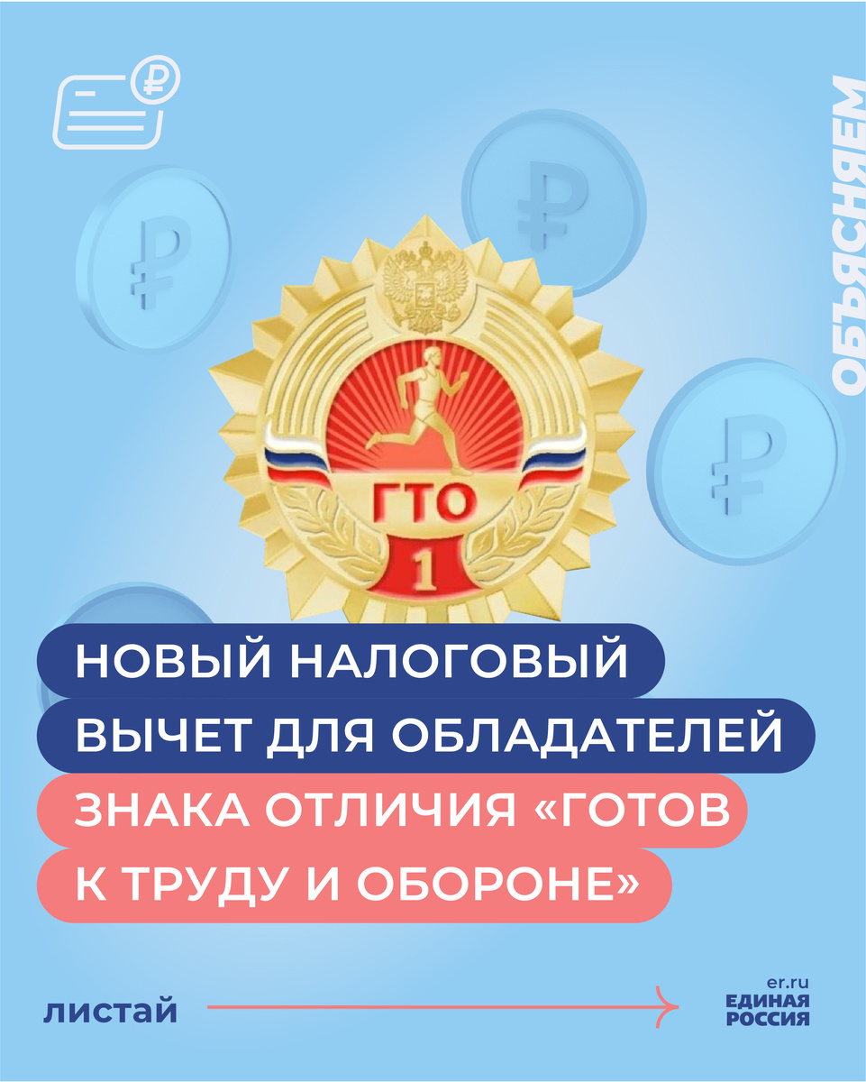 С 1 января 2025 года обладатели знака отличия «Готов к труду и обороне» смогут вернуть часть уплаченного НДФЛ.Рассказываем, кто и как сможет оформить налоговый вычет. Листайте наши карточки.